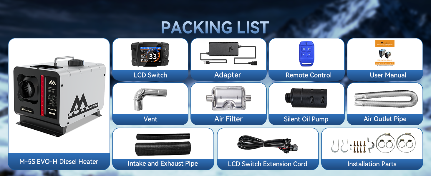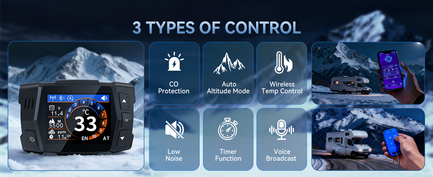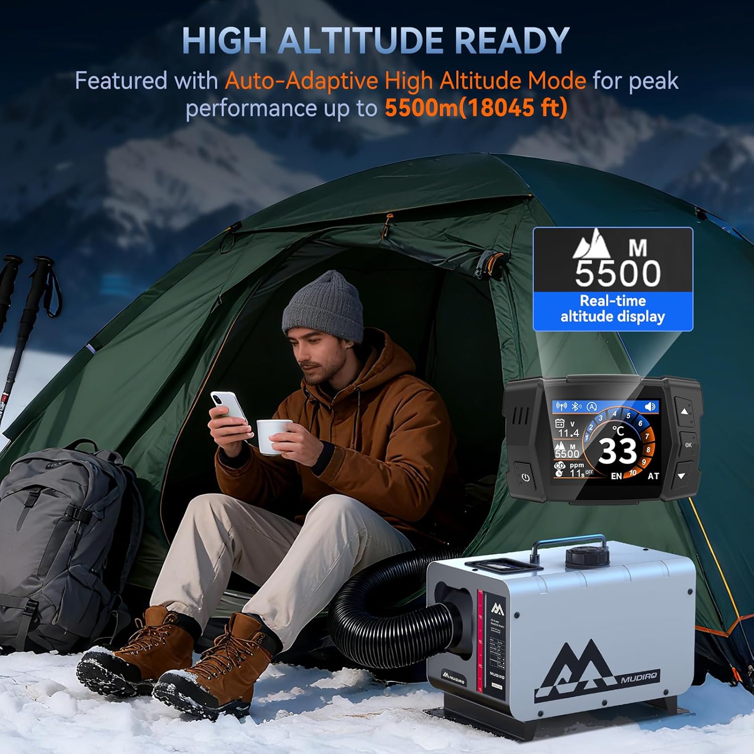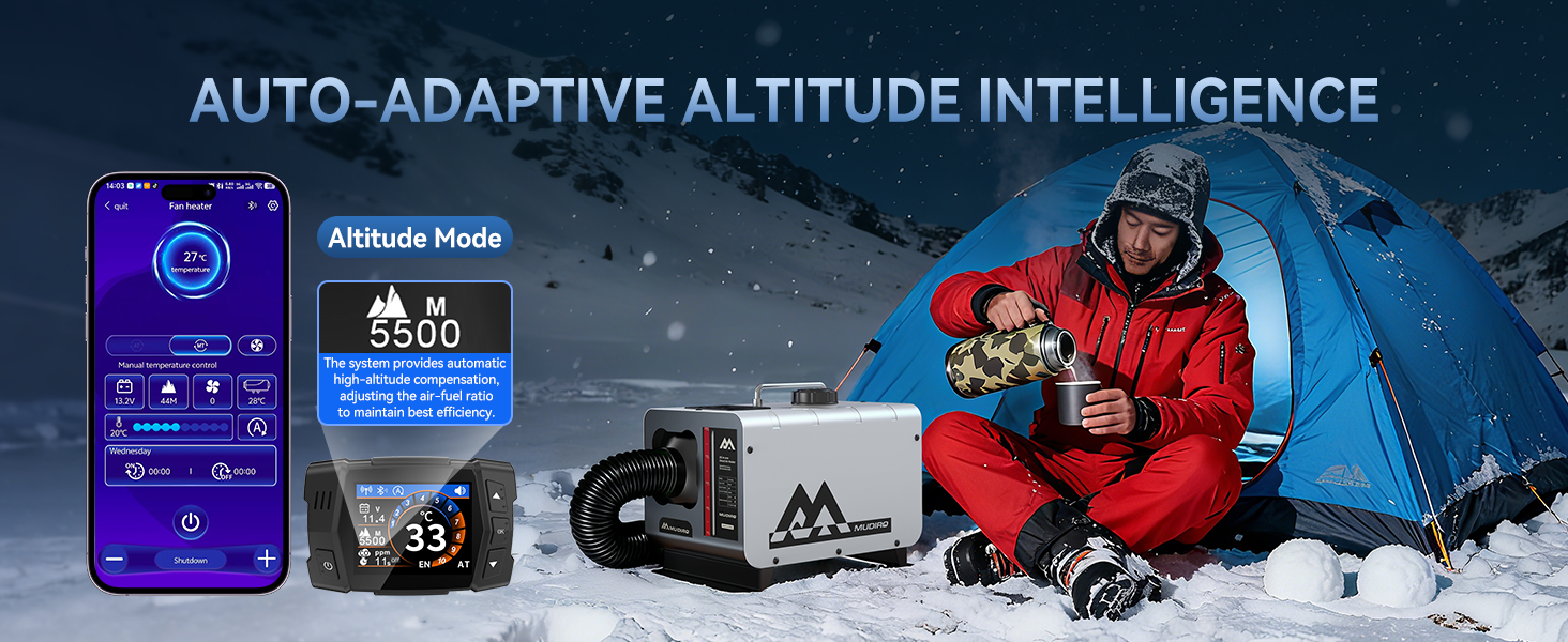Seamlessly adapts to elevations up to 18,045 ft (5,500 m). The TFT display shows real-time altitude while the system self-adjusts the air-fuel ratio—no manual intervention required for consistent heating performance in high-altitude conditions.