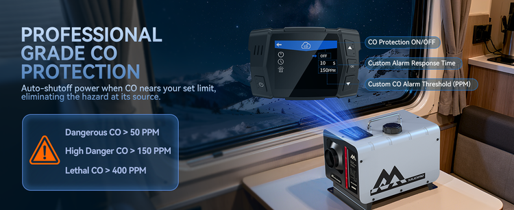Built-in carbon monoxide detection automatically triggers an alarm and shuts down the unit when unsafe CO levels are detected. Ensures safe indoor and outdoor operation in RVs, cabins, and enclosed spaces.